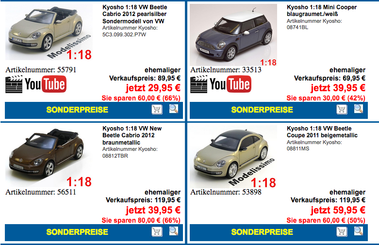 Modelissimo renoue avec de grands classiques pour ses promotions. Parmi les modèles les plus remisés, nous trouvons les Volkswagen Coccinelle et Mini Cooper, à l'échelle 1/18. Des miniatures dans des configurations classiques, de belle qualité et avec tous leurs ouvrants. Notons la présence de feutrine, de beaux ajustements et une belle finition.