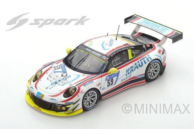 Également concurrente lors des 24 Heures du Nürburgring en 2017, la Porsche 911 GT3 R n°59 du Team Manthey Racing est proposée à l'échelle 1:43 par Spark. Une miniature de belle facture, des pilotes S. Smith - R. Walls - H. Proczyk - S. Müller. 300 exemplaires disponibles seulement. Référence : SG324.