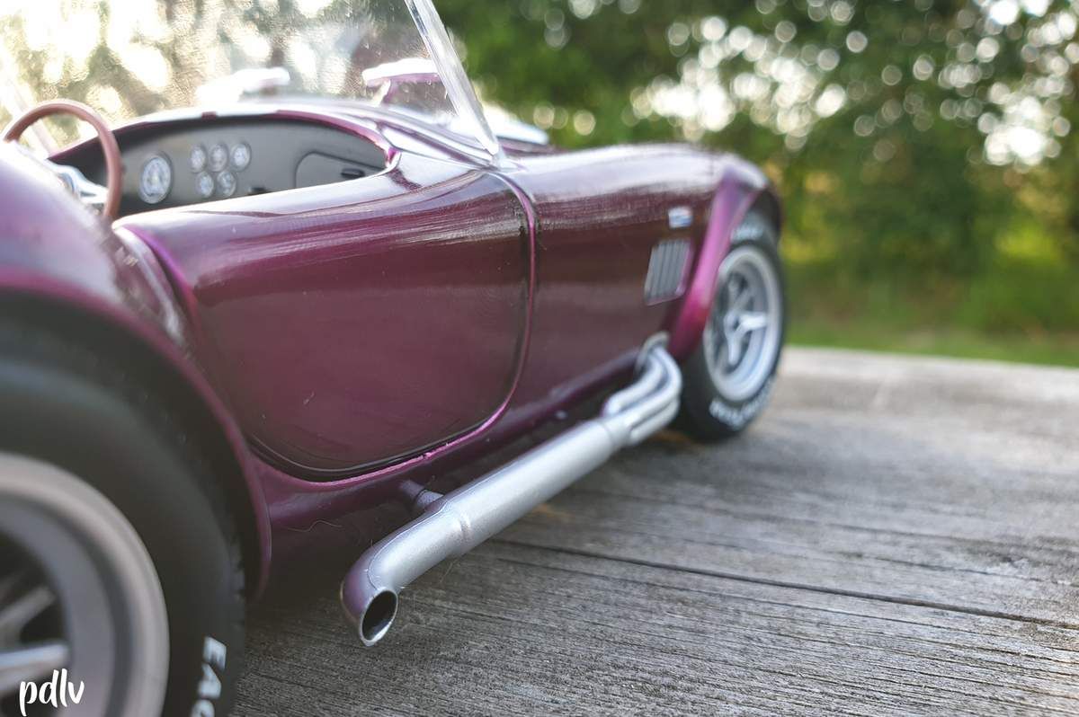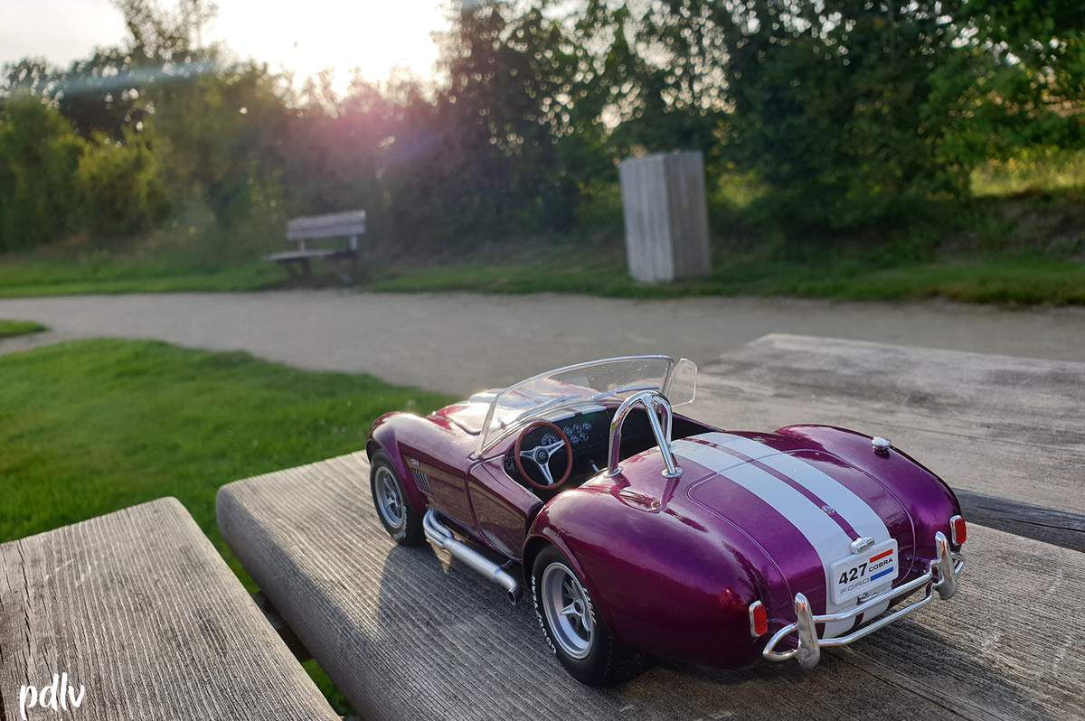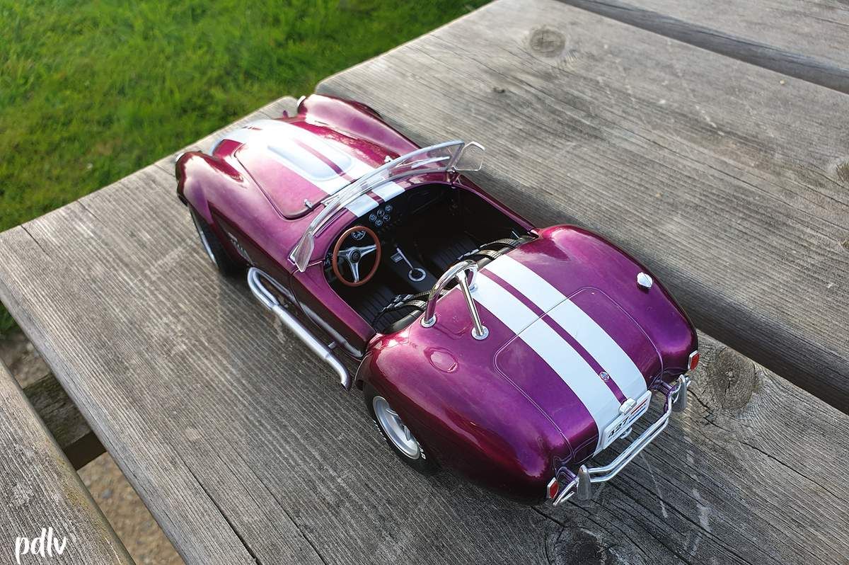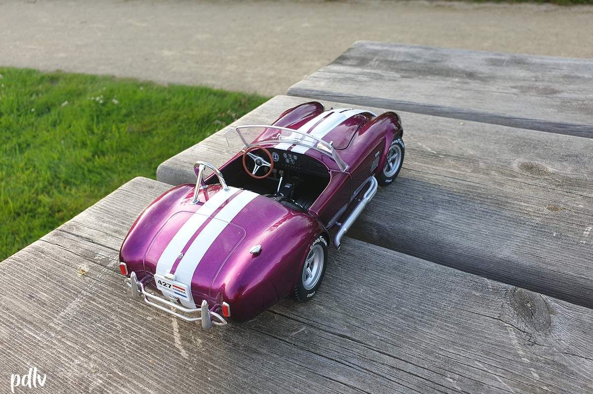 Par où commencer ? L'AC Cobra est née de la volonté de Carroll Shelby, de concurrencer les Ferrari sur circuit. Celle-ci prend la forme d'une barquette au look bodybuildée. Notre modèle est une phase 2, de 1969, bénéficiant du moteur 427 ci. C'est un puissant V8 de 7 litres fournissant 427 chevaux. Forcément, les performances sont décoiffantes pour l'époque... Et même encore aujourd'hui ! Le look a été savamment reproduit par Solido. On retrouve la ligne de caisse caractéristique, avec une somptueuse peinture Violet métallisé qui met bien en valeur les galbes de cette sportive.
