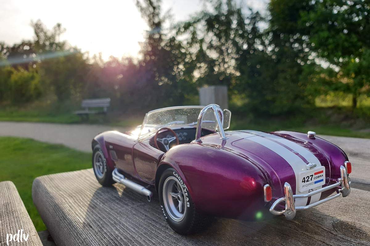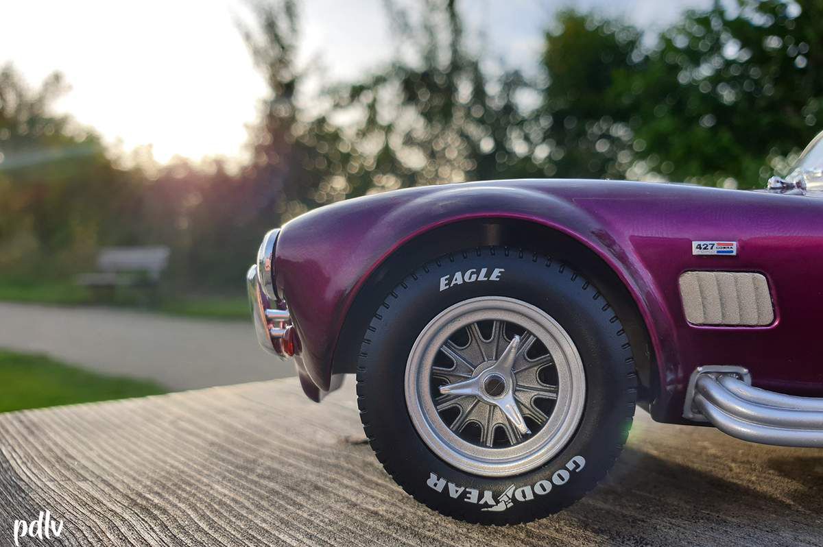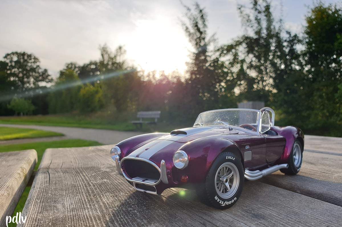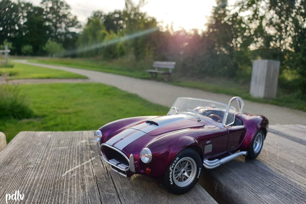 Par où commencer ? L'AC Cobra est née de la volonté de Carroll Shelby, de concurrencer les Ferrari sur circuit. Celle-ci prend la forme d'une barquette au look bodybuildée. Notre modèle est une phase 2, de 1969, bénéficiant du moteur 427 ci. C'est un puissant V8 de 7 litres fournissant 427 chevaux. Forcément, les performances sont décoiffantes pour l'époque... Et même encore aujourd'hui ! Le look a été savamment reproduit par Solido. On retrouve la ligne de caisse caractéristique, avec une somptueuse peinture Violet métallisé qui met bien en valeur les galbes de cette sportive.
