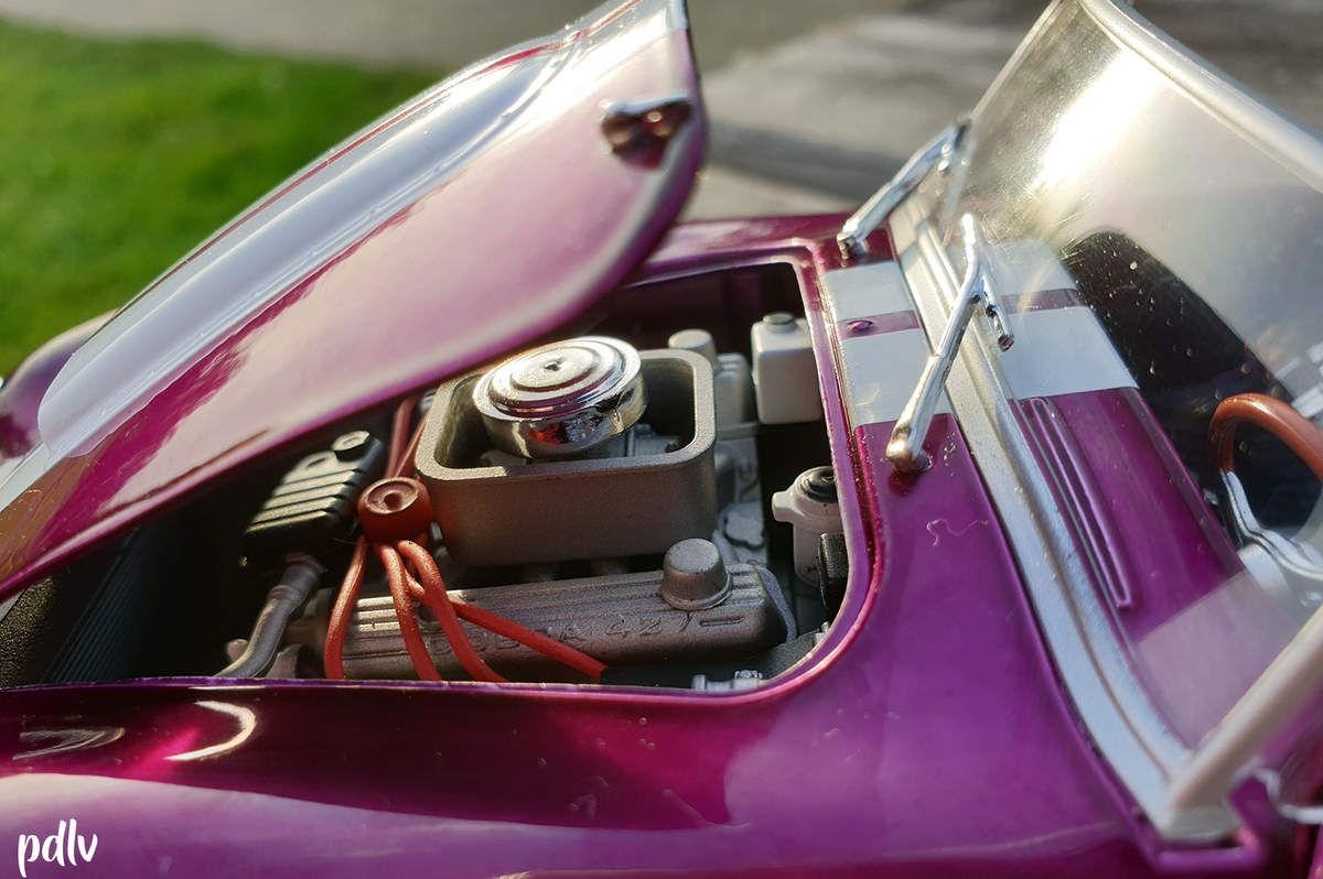 Le capot est également ouvrant. Il permet d'admirer une reproduction plutôt du puissant V8 d'origine Ford. Bien que simplifié, il ne dénote pas. On perçoit bien les 8 cylindres et différents câbles et durites. Une réussite, d'autant plus que les capots ouvrants demeurent rares chez Solido. Une vraie bonne surprise !